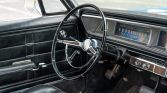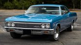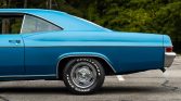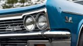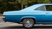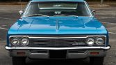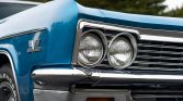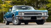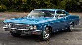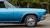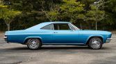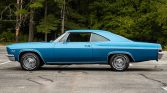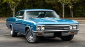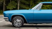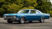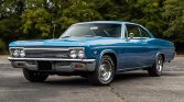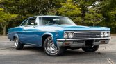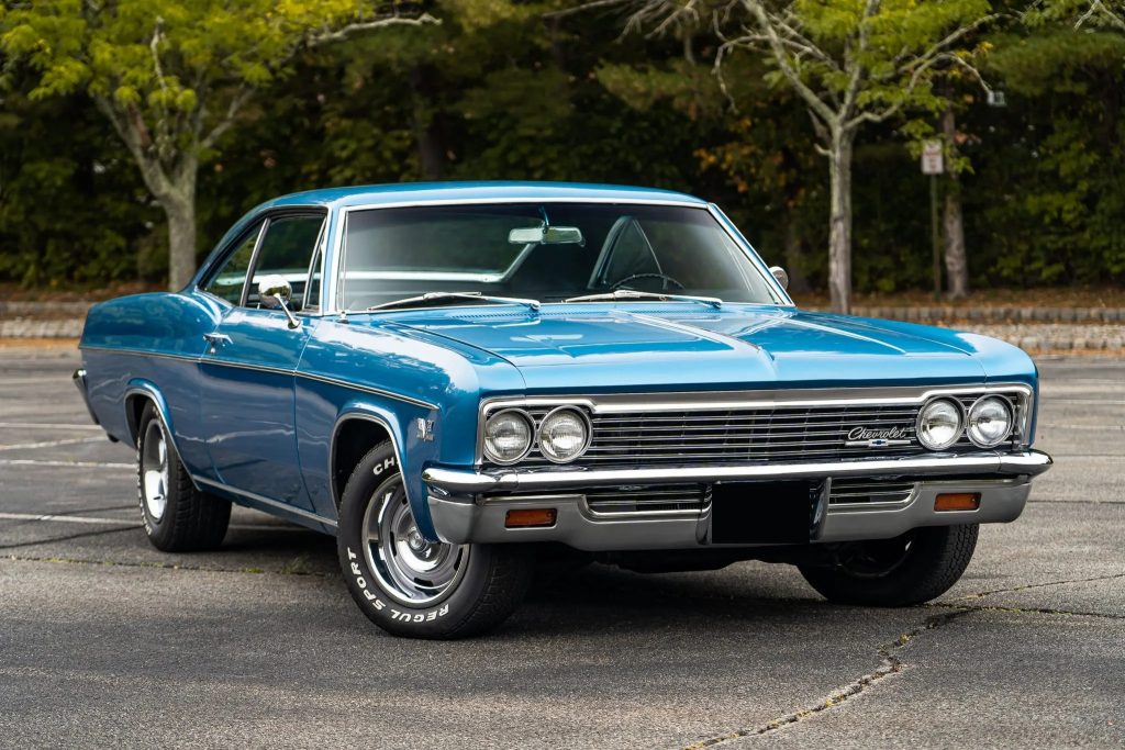 This 1966 Chevrolet Impala sport coupe is powered by a 396ci V8 mated to a TH400 three-speed automatic transmission, and it is finished in Marina Blue over black vinyl upholstery. Rally-style wheels and KYB shocks, and additional equipment includes chrome-finished bumpers, power front disc brakes, an aluminum radiator, a dual exhaust system, a center console, woodgrain trim, AutoMeter instrumentation, a retro-look digital stereo, air conditioning, and front bucket seats.