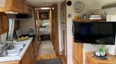 The double-axle chassis rides on steel wheels, and stopping is accomplished via electrically activated drum brakes. A Dexter lift kit has been installed, and additional equipment includes a Hensley anti-sway hitch as well as connections for water, waste disposal, and electrical service.