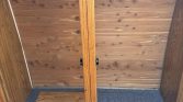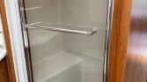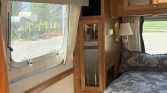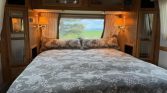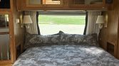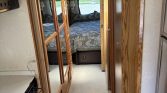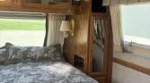 The rear bedroom has a mattress bracketed by cedar-lined wardrobe cabinets along with a pop-open window at the head of the bed. Additional appointments include two pop-open side windows, twin lamps, window shades, overhead cabinets, under-bed storage, and a Sony CD stereo with a CD changer.