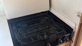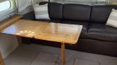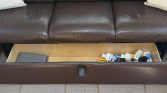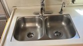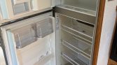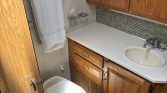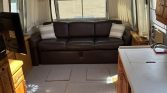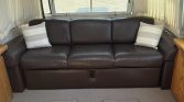 Gray carpets line the lounge, hallway, and bedroom floors. Woodgrain flooring is found in the kitchenette area, which also features a composite countertop, a three-burner propane range, a twin-basin stainless-steel sink, a Sharp combination microwave/convection oven, a refrigerator/freezer, and wood-face cabinetry. The lounge area includes a three-seat sofa that is wrapped in brown leather and features under-seat storage, and a fold-away wooden dining table is attached to the wall. A 32″ Samsung flat-screen Smart TV is secured to the microwave cabinet and is prepped for DirecTV satellite service, and a Penguin Duo-Therm air conditioner and heat pump is mounted overhead.
