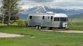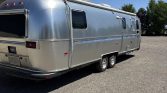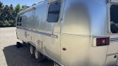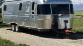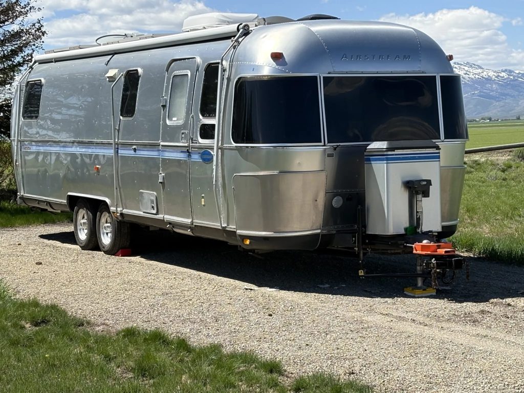 This 2000 Airstream Excella is a 31-foot tandem-axle travel trailer. The layout features a front lounge and dining area, a kitchenette, a lavatory, and a rear bedroom. Amenities include an anti-sway hitch, electrically activated drum brakes, patio and rear awnings, a roof-top satellite dish, air conditioning, solar panels, and wrap-around front windows in addition to woodgrain flooring and gray carpeting, a microwave oven, a refrigerator, and a flat-screen TV.