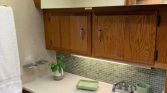 The lavatory features a vessel sink, a tile backsplash, a toilet, towel racks, overhead lighting, a ceiling vent, a toiletry cabinet, and a shower with a seat.